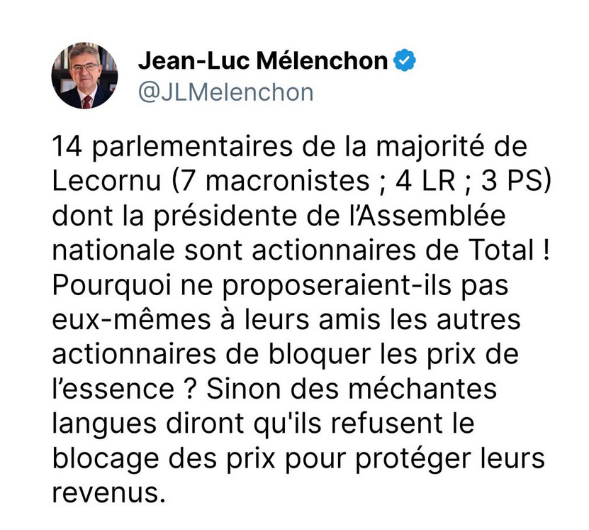 Les parlementaires de la coalition présidentielle (macronistes, LR, PS) et du RN qui possèdent des actions Total ont gagné 70000 € avec la hausse du cours de bourse suite à la guerre illégale déclenchée par les États-Unis et Israël en Iran et au Liban. Leurs partis refusent le blocage des prix des carburants qui soulagerait l’immense majorité de la population et empêcherait juste les pétroliers et leurs actionnaires de faire encore plus de profits. À longueur de plateaux télé, ils multiplient les fausses informations et énoncent des « solutions » qui ne résoudront rien.