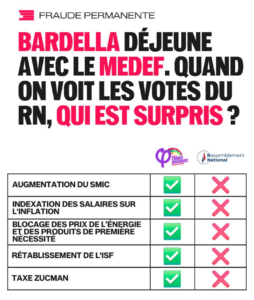 Et du côté du Rassemblement national, dont Julien Guibert est député dans la 2e circonscription de la Nièvre où se trouve Corbigny ? Pareil. On propose de baisser les taxes, ce qui n’empêche en rien les pétroliers de continuer à augmenter les prix mais réduit les recettes de l’État, donc sa capacité à financer les services publics. Pour quelques centimes gagnés temporairement, c’est la part gratuite de santé, d’éducation, de transports, de culture qu’on réduit durablement. Et pour faire face aux nouvelles dépenses, ne comptez pas sur eux. Le RN refuse d’augmenter le SMIC comme de taxer les plus riches. Bardella et Le Pen préfèrent déjeuner avec eux.