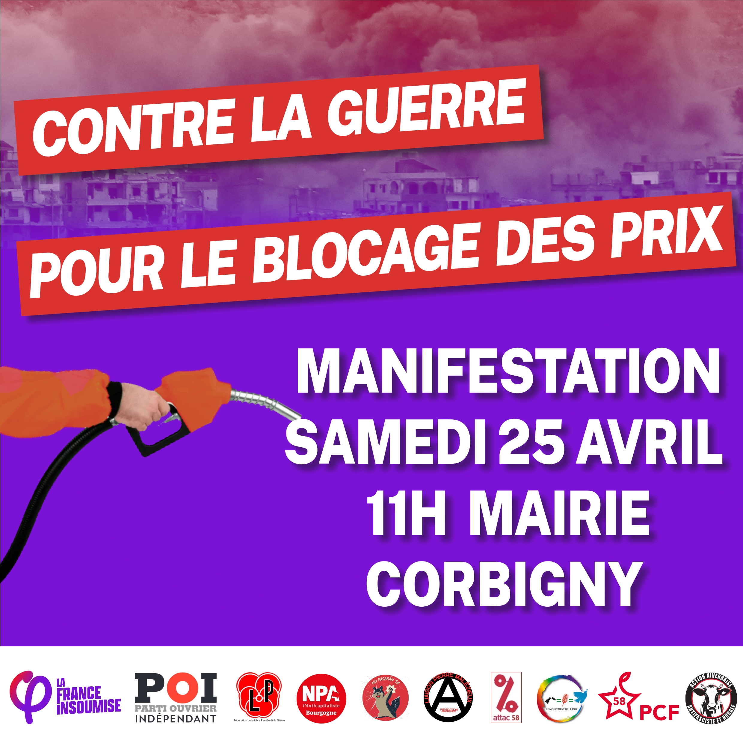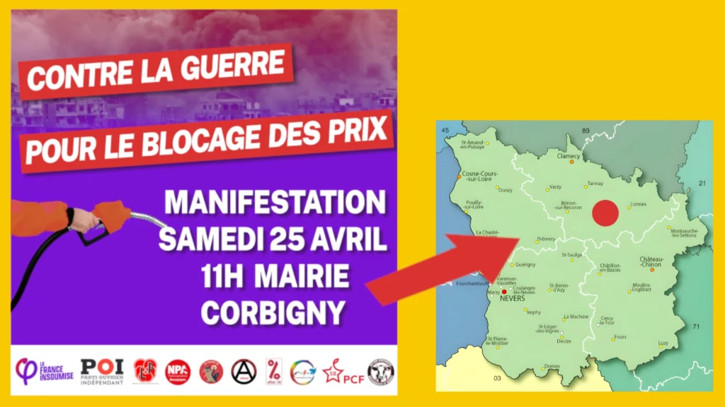 La France insoumise dans la Nièvre, rejointe par une dizaine d’organisations1La manifestation partira de la mairie de Corbigny à 11h. Ont déjà appelé à la rejoindre : le Parti ouvrier indépendant 58, la Libre Pensée, le NPA Bourgogne, No Passaran 58, la Fédération anarchiste 58, Attac 58, le Mouvement de la Paix 58, le PCF 58, Action nivernaise antifasciste et rurale., appelle à manifester contre la guerre et pour le blocage des prix ce samedi 25 avril à 11h à Corbigny.